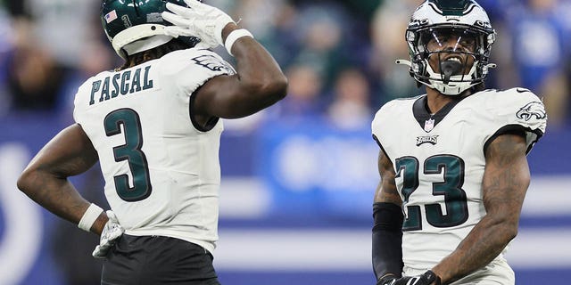 Zach Pascal #3 of the Philadelphia Eagles and C.J. Gardner-Johnson #23 of the Philadelphia Eagles celebrate after a fourth down stop during the fourth quarter against the Indianapolis Colts at Lucas Oil Stadium on November 20, 2022 in Indianapolis, Indiana. (Andy Lyons/Getty Images)